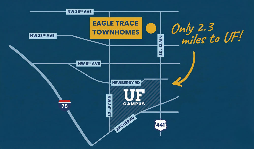 Eagle Trace Townhomes, located in the heart of NW Gainesville, just 2.3 miles from UF on 27 beautiful acres! The new construction buildings just got their certificate of occupancy this year, and models are open 7 days a week.
